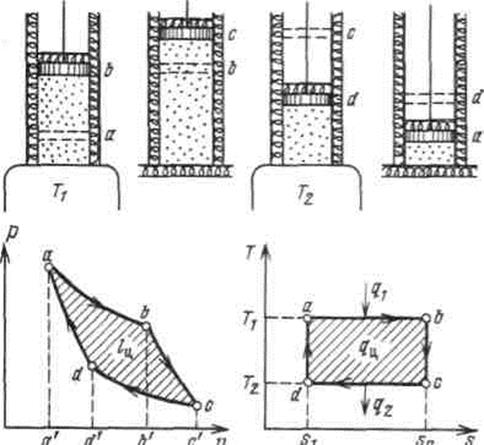 Рассмотрим простейший случай, когда имеется один горячий с температурой T1 и один холодный с температурой T2 источники теплоты. Теплоемкость каждого из них столь велика, что отъем рабочим телом теплоты от одного источника и передача ее другому практически не меняет их температуры. цикл, состоящий из двух изотерм и двух адиабат, носит название цикла К а р н о, поскольку именно с его помощью С. Карно в 1824 г. установил основные законы превращения тепловой энергии в механическую. Осуществление цикла Карно в тепловой машине можно представить следующим образом. Газ (рабочее тело) с начальными параметрами, характеризующимися точкой а, помещен в цилиндр под поршень, причем боковые стенки цилиндра и поршень абсолютно нетеплопроводны, так что теплота может передаваться только через основание цилиндра.