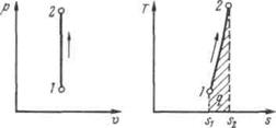 Рисунок 5.1 - Изображение изохорного процесса в р,v- и T, s -координатах Работа расширения в этом процессе равна нулю, так как dv= 0. Количество теплоты, подведенной к рабочему телу в процессе 12 при