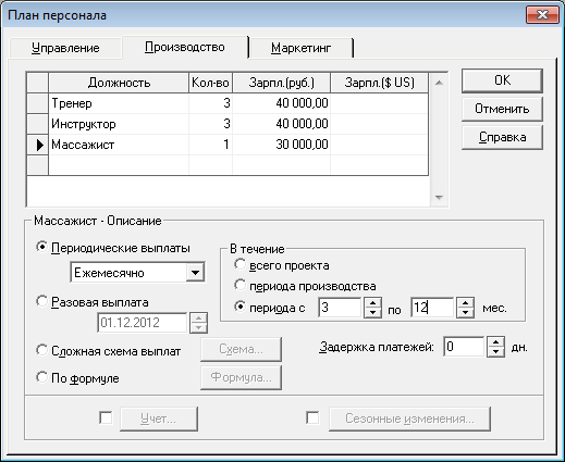 Раздел «План персонала» предназначен для учета затрат на содержание сотрудником предприятия, в данном случае, для создания фитнес-клуба «Манго» потребуются: - Директор; - Инструктор; - Тренер; -Массажист; -Маркетолог