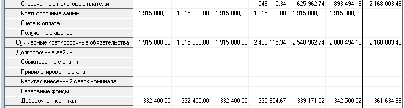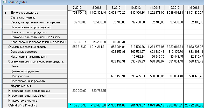 В отчете «Баланс» мы отражаем остатки по всем счетам бухгалтерского учёта на отчётную дату, просматриваем структуру активов, обязательств и собственных средств предприятия на каждом этапе реализации проекта. На основе анализа баланса вырабатываем стратегию управления капиталом.