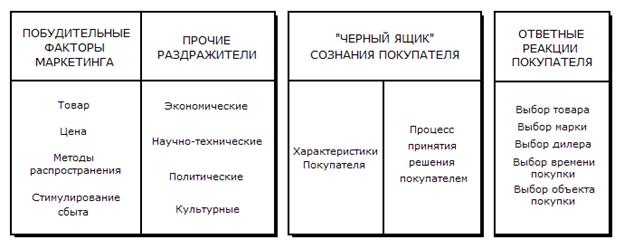 Фирма, по-настоящему разобравшаяся в том, как реагируют потребители на различные характеристики товара, цены, рекламные аргументы и т.п., будет иметь большое преимущество перед конкурентами. Именно поэтому тратится так много времени и усилий на исследование зависимостей между побудительными факторами маркетинга и ответной реакцией потребителей. Исследование потребителя в маркетинге ставит целью определить весь комплекс побудительных факторов, которыми руководствуется потребитель при выборе товаров. Эти факторы носят экономический, социальный, психологический характер: доходы, цены, групповые интересы, демография, традиции, мотивация и т. п. Одним из подходов в изучении зависимости побудительных факторов и ответной реакции потребителей является моделирование покупательского поведения. При помощи построения модели специалисты по маркетингу пытаются определить – как именно реагируют потребители на разные побудительные приемы и факторы маркетинга, которые предприятия используют и которые позволяют получить им конкурентные преимущества. Классическая модель потребительского поведения может быть представлена следующим образом: Модель поведения конечного потребителя: Описание потребности – Поиск и оценка информации – Принятие решения о покупке – Оценка правильности выбора. Покупка — это всегда компромисс, ожидаемый риск. Одним из методических подходов в решении данной задачи служит «модель черного ящика». При моделировании принятия решения о покупке «черный ящик» рассматривается как набор определенных стимулов, под воздействием которых происходит принятие решения о покупке. Это стимулы внутреннего характера (физические и духовные потребности, стремление к самоутверждению, склонность к экономии) и стимулы внешнего характера (групповые интересы, обычаи, традиции).