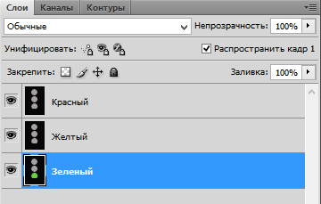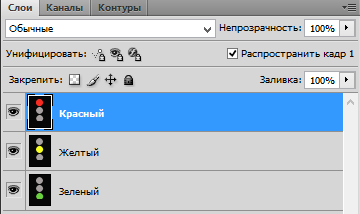 3. Создайте две копии этого слоя (Слой – Создать дубликат слоя) – соответственно “Желтый” и “Красный”. Обратите внимание, что изображения светофора в этих слоях должны располагаться строго друг под другом.
