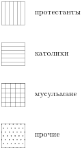 Решение: протестанты заштрихованы вертикальными линиями, Более 50% - это больше половины круга. Больше половины круга вертикально заштриховано США. Ответ: 2. Решите самостоятельно: 2. На диаграмме показаны религиозные составы населения Германии, США, Австрии и Великобритании. Определите по диаграмме, в какой стране доля мусульман превышает 4%.