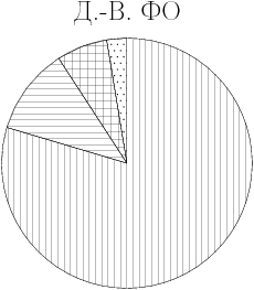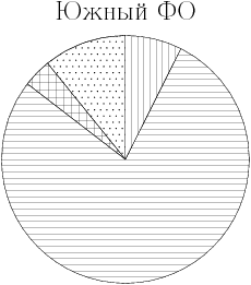 3. На диаграмме показано распределение земель Уральского, Приволжского, Южного и Дальневосточного Федеральных округов по категориям. Определите по диаграмме, в каком округе доля земель сельскохозяйственного назначения превышает 70%.