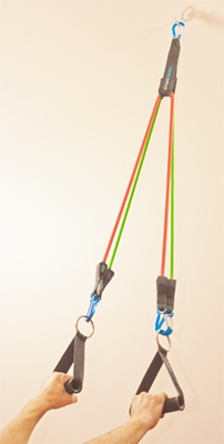 Начинайте делать упражнение с легкой нагрузкой, чтобы освоить технику выполнения упражнения. Затем по чуть-чуть прибавляйте нагрузку за счет добавления дополнительной эластичной трубки или замены трубки на другую, с большим сопротивлением. И так находите такое сопротивление, с которым вы сможете с трудом, но с правильной техникой выполнить 10-12 повторений в подходе или 18-20 в зависимости от целей тренинга. Больше 10-12 повторений выполнить упражнение не хватит сил. Это и есть Ваше рабочее сопротивление.