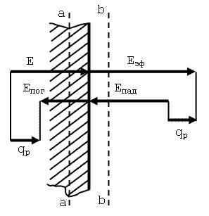 При расчете лучистого теплообмена между телами большое значение имеет результирующее излучение, представляющее собой разность между лучистым потоком, получаемым телом, и лучистым потоком, который оно испускает в окружающее пространство. Для определения плотности потока результирующего излучения qр полагая коэффициент пропускания тела равным нулю составим уравнение баланса энергии, проходящей через плоскости а—а и b—b, одна из которых расположена внутри, а другая снаружи тела вблизи его поверхности (рис. 11.1). Для плоскости а—а