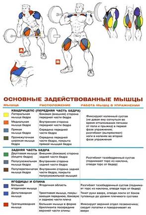 Приседания со штангой: Техника • Станьте лицом к грифу посередине атлетической рамы. Подсядьте под гриф штанги (поставив ступни точно под гриф) и упритесь в него верхней частью трапеций. Возьмитесь за штангу хватом сверху чуть шире плеч и выпрямитесь. • Слегка отступите назад (так, чтобы упоры не мешали штанге свободно опускаться вниз). Поставьте ноги на ширине плеч и чуть разведите носки в стороны. Спина и ноги выпрямлены. Вес штанги полностью распределяется на обе ступни (по всей их плоскости). Это и есть исходное положение. • Сделайте глубокий вдох и, задержав дыхание, плавно опуститесь вниз. Представьте, что вы садитесь на стул, расположенный позади вас: колени сгибаются и чуть выдвигаются вперед, ягодицы движутся назад и вниз, а торс при этом наклоняется вперед, до 45° по отношению к вертикали. • Приседая, сосредоточьтесь на удержании позвоночника в естественном S-образном положении. Не скругляйте спину! • На протяжении всего упражнения взгляд направлен строго вперед, а пятки прочно упираются в пол. • Как только бедра окажутся параллельными полу (нижняя точка упражнения), по-прежнему задерживая дыхание, изо всех сил напрягите мышцы бедер и поднимитесь вверх в исходное положение. • Начинайте выдох после того, как преодолеете самый сложный участок подъема. Продолжайте выдыхать до тех пор, пока не примите исходное положение. Советы • В целях безопасности всегда держите спину слегка прогнутой в пояснице. Не расслабляйте поясничные мышцы, пока не опустите штангу на упоры. Скругление спины повышает риск травмы и снижает эффективность упражнения. • Держите мышцы живота напряженными на протяжении всего сета. Это существенно облегчает удержание туловища в устойчивом положении и предотвращает его раскачивание. Тем не менее не переусердствуйте: чересчур сильно напрягая пресс, вы невольно начнете скруглять спину. • Приседая и выпрямляясь, ни в коем случае не отрывайте пятки от пола. Приседая на носках (а не на ступнях), вы тяряете устойчивость и рискуете травмировать коленный сустав (он будет чересчур сильно выдвигаться вперед). В нижней точке колени не должны «вылазить» за линию пальцев ног. • Глубина приседа (нижняя точка упражнения) определяется исключительно тем, насколько у вас хватит сил держать естественный изгиб позвоночника и не отрывать пятки от пола во время приседания. Если чувствуете, что спина начинает скругляться, а пятки приподнимаются над полом, не приседайте ниже. • Если расстояние между ступнями чуть меньше или равно ширине плеч, то фокус нагрузки приходится на квадрицепсы и они задействованы гораздо сильнее мышц задней части бедра. Но такая постановка ног требует отменной гибкости тазобедренного сустава и ахиллесова сухожилия (иначе вам не удастся опустить бедра до параллели с полом). Если ступни расположены шире плеч, вы можете приседать с более тяжелым весом и не беспокоиться за гибкость тазобедренного сустава. Однако «первую скрипку» здесь играют уже мышцы задней части бедра, а не квадрицепсы. Применение Кому: Атлетам среднего уровня подготовки и выше. Когда: Первым упражнением в тренировке ног. После приседаний выполните гакприседания, жимы ногами, выпады и разгибания ног в тренажере. Сколько: 3-5 сетов по 6-12 повторений. Спорт Приседания со штангой — самое эффективное упражнение для наращивания масс