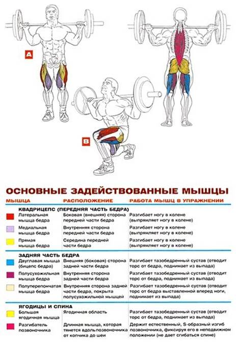 Выпады со штангой назад: Техника • Встаньте в тренажер Смита, подсядьте под гриф и упритесь в него верхними трапециями. Возьмитесь за гриф хватом сверху шире плеч. Полностью выпрямитесь: взгляд направлен вперед, грудь «колесом», живот подтянут, спина слегка прогнута в пояснице, колени чуть согнуты. Ступни параллельны и слегка выставлены вперед по отношению к бедрам. • Сделайте вдох и, задержав дыхание, отшагните одной ногой назад, одновременно приседая на другой (передней) ноге. • Опускаясь на передней ноге, отводите таз назад. • В нижней точке упражнения передняя нога согнута в колене под углом 90°, а ее голень перпендикулярна полу. Колено отставленной назад ноги не касается пола, и она также согнута в колене почти под прямым углом. Туловище выпрямлено, мышцы поясницы напряжены и фиксируют легкий прогиб в пояснице. Вы должны прочувствовать, что держите штангу исключительно усилием мышц передней ноги, лишь слегка опираясь на отставленную назад ногу (только для равновесия). • Достигнув нижней точки упражнения, напрягите квадрицепс передней ноги, чуть подайте туловище вперед и поднимитесь на передней ноге, одновременно отрывая от пола и подтягивая вперед отставленную назад ногу. • Преодолев самый сложный участок подъема, сделайте выдох и примите исходное положение (ноги вместе). • Выполняйте сет, чередуя ноги или же отрабатывая все повторения сета вначале для одной ноги, а затем для другой. • На протяжении всего упражнения удерживайте торс в вертикальном положении, а спину — слегка прогнутой в пояснице. Советы • Обязательно опускайтесь в приседе до тех пор, пока бедро передней ноги не станет параллельным полу (угол в колене 90°). Именно такое положение гарантирует, что в полную силу будут работать не только квадрицепсы, но и мышцы задней части бедра, включая ягодицы. Чем ниже вы приседаете, тем больше нагрузка на заднюю часть бедра и ягодицы. • Не расслабляйте поясничные мышцы и пресс до самого конца сета. В противном случае вам не удержаться от округления спины и наклона туловища вперед во время выпада, что крайне опасно и может привести к травме. • Шаг назад (выпад) должен быть достаточно широкий, иначе в нижней точке упражнения голень будет наклонена вперед, что крайне нежелательно, так как при этом часть нагрузки с квадрицепсов переносится на коленный сустав, что снижает эффективность упражнения и повышает риск заработать травму. • Главная цель выпадов назад — мышцы передней части бедра, квадрицепсы. Именно они играют здесь первую скрипку. Бицепс бедра и ягодицы в этом упражнении лишь ассистируют квадрицепсам (хотя, стоит отметить, весьма эффективно). Поэтому, если ваш тазобедренный сустав недостаточно гибкий, опускайтесь вниз лишь до тех пор, пока в состоянии держать туловище в вертикальном положении и прогиб в пояснице. Ведь гораздо важнее уберечь позвоночник от травмы, чем заставить работать в полную силу мышцы задней части бедра и большие ягодичные. Тем более что вы можете это сделать, используя такие целевые упражнения, как наклоны со штангой, румынский подъем, становая тяга и так далее. • Глубокий вдох и задержка дыхания на время выпада увеличивает внутрибрюшное давление, что помогает держать мышцы, окружающие позвоночник, в постоянном напряжении. Что, в свою очередь, залог того, что вы не наклоните торс и не скруг