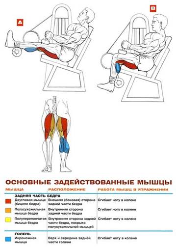 Сгибание ног сидя: Техника • Сядьте в тренажер для сгибаний ног так, чтобы колени вылазили за край сиденья, позволяя сгибать ноги в коленях по максимально возможной амплитуде. Упритесь задней частью голени в валики. В исходной позиции ноги выпрямлены (но не до блокировки в коленях!) или чуть согнуты. • Возьмитесь за рукоятки и слегка отклоните корпус назад (предварительно установив под наклоном спинку сиденья). Это немного ослабит натяжение в мышцах задней части бедра. • Сделайте глубокий вдох и, задержав дыхание, согните ноги. • На протяжении сета старайтесь держать прямой угол в голеностопном суставе (носки кроссовок направлены вверх). • Когда в коленном суставе образуется угол 90° (нижняя точка упражнения), остановитесь и постарайтесь максимально напрячь мышцы задней части бедра. • Плавно вернитесь в исходное положение и выполните следующее повторение. Советы • Если у вас тугие мышцы задней части бедра, то в исходном положении их тазобедренные сухожилия натянутся, как струна, и вы просто не сможете начать упражнение, не согнув ноги. В этом случае отклоните туловище назад как можно больше и начинайте упражнение на почти выпрямленных ногах, по мере сгибания ног поднимайте торс из наклона в вертикальное положение. • Если ваши мышцы задней части бедра достаточно эластичные, а коленные суставы достаточно гибкие, то вам ничто не мешает начинать упражнение с выпрямленными ногами, но перед тем как начинать сгибание, обязательно изо всех сил напрягите мышцы бедра. Стараясь сдвинуть груз на расслабленных связках, вы рискуете травмировать колени. • Если во время сгибания ног ступни сами по себе поворачиваются внутрь или наружу, это верный признак того, что в развитии полуперепончатой/полусухожильной мышц и двуглавой мышцы бедра существует дисбаланс, который необходимо устранить. Если ступни самопроизвольно поворачиваются внутрь, то всегда держите носки ног направленными наружу. И наоборот, если ступни разворачиваются наружу — держите носки ног направленными внутрь. • В то время как сгибания ног лежа фокуссируют нагрузку на нижней половине мышц задней части бедра, сгибания ног сидя позволяют добиться еще большей изоляции нагрузки — оно прицельно бьет по внутренней стороне этого участка мышц, по низу полусухожильной и полуперепончатой мышц, практически «выключая» из работы бицепс бедра. Применение Кому: Всем, от новичка до мастера. Когда: В конце тренировки ног. Перед сгибаниями ног сидя отработайте все базовые упражнения для ног, такие как приседания, жимы ногами, выпады и становая тяга. Сколько: 3-4 сета по 10-15 повторений. Спорт Сгибания ног сидя утолщают низ полусухожильной и полуперепончатой мышц, которые расположены с внутренней стороны бедра, что визуально удлиняет бедро книзу, если смотреть на него сзади. В фитнесе это упражнение используется для того, чтобы сбалансировать развитие мышц задней части бедра (подтянуть отстающую внутреннюю сторону к более развитой внешней, бицепсу бедра) и добиться четкого разделения мышц между собой. Мышцы задней части бедра стабилизируют коленный сустав, когда вы приседаете или приземляетесь на ноги. Чем сильнее эти мышцы, тем меньше вероятность травмировать колено. Поэтому никогда не пренебрегайте сгибаниями ног сидя. По мнению спортивных врачей, это одно из самых эффективных ср