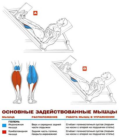 Подъёмы на носки в тренажёре для жимов ногами: Техника • Сядьте в тренажер для жимов ногами и плотно прижмите ягодицы и поясницу к сиденью. • Поставьте подушечки ступней ближе к нижнему краю платформы так, чтобы пятки выступали за ее край, позволяя полностью разогнуть голеностопный сустав. Ступни параллельны или чуть развернуты носками наружу. Расстояние между ступнями выбирается произвольно — так, как вам удобно. • Разблокируйте платформу, возьмитесь за боковые поручни и выжмите ее вверх. В исходном положении ноги выпрямлены (но не заблокированы в коленях) или чуть-чуть согнуты. • Не сгибая ноги в коленях, плавно разогните голеностопный сустав, позволяя платформе опуститься вниз. В нижней точке ахиллесовы растянуты, но не до предела. • Сделайте вдох и задержите дыхание. Напрягите икры и встаньте на носки, выжимая платформу вверх. Темп движения — медленный или умеренный. На пару секунд остановитесь и изо всех сил напрягите икры. • Выдыхая, разогните голеностопные суставы и опуститесь в исходное положение. • Амплитуда движения относительно небольшая — угол сгибания-разгибания голеностопного сустава не больше 30-45°. Советы • Поднимайтесь на носки и опускайтесь в медленном или умеренном темпе. Выполняя движение быстро, вы можете непроизвольно выпрямить ноги до отказа и заблокировать их в коленях или попросту соскользнуть с платформы. И то и другое крайне опасно. • Принципиально важна относительно короткая амплитуда движения. Не следует разгибать и сгибать голеностопный сустав до конца. В этом упражнении именно сокращенная амплитуда является наиболее оптимальной для наращивания силы и массы икр. Полностью разгибая голеностопный сустав (когда вы тянете носок на себя и платформа опускается), вы рискуете не удержать платформу, и она может соскользнуть с подушечек ступней. • Не выполняйте упражнение, если платформа тренажера или подошва вашей обуви имеет гладкую поверхность. • Держите поясничные мышцы, бедра и пресс в постоянном напряжении и фиксируйте тело в неподвижном положении. Движение происходит только в голеностопном суставе. • Не распрямляйте ноги до предела (до щелчка в коленях), когда жмете платформу, — это опасно! • Задерживайте дыхание в позитивной фазе (когда жмете платформу носками) и сосредотачивайте все свое внимание на сокращении икроножных мышц. Выдыхайте в негативной фазе, позволяя платформе плавно опускаться под вашим полным контролем. Применение Кому: Всем, от новичка до мастера. Когда: В самом начале тренировки, посвященной икроножным мышцам. После подъемов на носки в тренажере для жимов ногами выполните подъемы на носки сидя. Сколько: 3-4 сета по 10-15 повторений. Спорт Подъемы на носки в тренажере для жимов ногами «подрезают» низ икроножной мышцы и выделяют ее внутреннюю сторону, благодаря чему икра выглядит гораздо объемнее, если смотреть на нее сзади. Сгибание голеностопного сустава — ключевое движение в спортивной ходьбе, беге и прыжках, так как именно подъем на подушечки стоп и отталкивание от земли сообщает телу финальный импульс, который выталкивает его вперед или вверх. Например, в беге или спортивной ходьбе до 50% от общего усилия всех мышц, толкающих тело вперед, приходится исключительно на мышцы задней части голени. Именно поэтому сила этих мышц крайне важна во всех видах спорта, которы