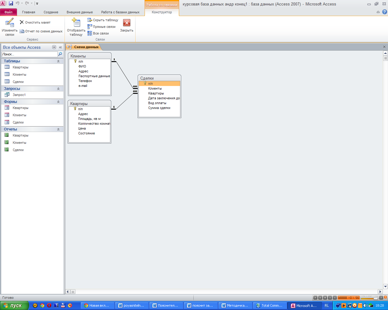 5) Далее я связал таблицы. Связь между таблицами определяет тип отношений между их полями. Как правило, связывают ключевое поле одной Между сущностями «Квартиры» и «Сделки», а так же между сущностями «Клиенты» и «Сделки» необходимо установить связь «один-ко-многим». Для этого на вкладке «Работа с базами данных» в группе «Отношения» я выбрал элемент «Схема данных» (рисунок 5).