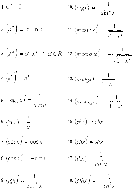 Определение 21.1 Пусть функция Определение 21.2 Пусть функция Если функция определена на некотором промежутке и в каждой его точке существует ее производная, то эта производная, очевидно, является функцией, определенной на данном промежутке (обозначается Определение 21.3 Функция Определение 21.4 Пусть функция Таблица производных основных элементарных функций