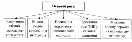 Схема 20.1. Основні риси економічної глобалізації зація торгівлі і міжнародних зв'язків. Глобалізація пов'язана з колосальним накопиченням капіталу окремими компаніями та країнами, що супроводжуються переростанням останнього в транснаціональний капітал та його домінуванням над економіками багатьох країн і їх політичними можливостями. Впливає на ці процеси і створення світовою матеріальною культурою деяких нових технологій, продуктів споживання та послуг, що стають глобально затребуваними. До них можна віднести Інтернет-технології та послуги, космічні технології, мобільний зв'язок, швидкісний транспорт, деякі медичні препарати, харчові продукти тощо. Швидкому поступові глобалізації сприяє бурхливий розвиток інформаційних і комунікаційних технологій та опанування світом ідеї мережевого способу організації суспільної діяльності. Цей спосіб, за визначенням академіка М. Згуровського, став безальтернативним для інформаційного середовища, фінансової, торгової, телекомунікаційної, транспортної та інших систем взаємодії між людьми. Він є головним двигуном майбутнього розвитку не тільки економіки, а й науки, культури, соціального життя. Глобалізація економіки - це багатогранні процеси, що відбуваються у світовому господарстві. При всій їй багатоманітності можна виділити найхарактерніші риси чи ознаки, що розкривають суть економічної глобалізації (див. схему 20.1). Економічна глобалізація насамперед характеризується інтернаціоналізацією господарського життя. Це об'єктивний процес виникнення і розвитку зв'язків між національними економіками різних країн, що охоплює всі сторони економічного життя країн. Економічна глобалізація проявляється у поглибленні процесів обмиту товарами і послугами, розширенні міжнародного руху капіталів, посиленні трудових міграційних процесів у межах світового господарства, зростанні ролі міжнародних науково-технічних зв'язків. Цей процес зародився і розвивався із становленням товарно-грошових відносин. В останній третині XX ст. він розвивався особливо активно, що зумовлено революційними змінами в науково-технічній, транспортно-комунікаційній, інформаційній та соціальній сферах. Посилилася економічна цілісність світового господарства, що реалізується на ринкових міжнародно-інституційних засадах. Усе це посилює глобальні тенденції у світовій економіці. Суттєвою ознакою глобалізації економіки є розвиток процесів міжнародної економічної інтеграції, що проявляється в усуненні відмінностей між економічними суб'єктами - представниками різних країн. Розвиток процесів міжнародної економічної інтеграції зумовлений рядом факторів: нерівномірністю розподілу ресурсів між різними країнами, що впливає на їх економічний розвиток; закономірностями науково-технічного прогресу, які зумовлюють об'єднання зусиль багатьох країн; тенденціями демографічного розвитку, що посилюють відмінності між країнами у кількості та якості населення; різким скороченням відстаней завдяки розвитку транспортно-комунальних мереж; наявністю і необхідністю спільного розв'язання таких проблем, як екологічна, продовольча, сировинна, використання Світового океану та космосу. Під впливом цих факторів здійснюється процес міжнародної економічної інтеграції, який відбувається у двох напрямах: транснаціоналі