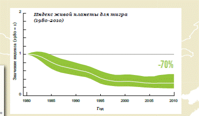 Рост численности населения, несомненно, скажется на состоянии мирового биоразнообразия и величине экологического следа человечества. Однако для состояния планеты имеет значение не только абсолютная численность населения: потребление товаров и услуг каждым человеком, а также затраты ресурсов и образование отходов при производстве этих товаров и услуг также играют важную роль. Следующие страницы посвящены более детальному анализу взаимосвязи между динамикой численности населения, экологическим следом и состоянием биоразнообразия. Является ли высокий уровень потребления необходимым условием высокого уровня развития? В настоящее время наиболее популярным показателем уровня развития является используемый Программой развития ООН (ПРООН) индекс развития человеческого потенциала (ИРЧП). Это индекс, учитывающий доход на душу населения, ожидаемую продолжительность жизни и охват населения образованием, позволяет сравнивать уровень социально-экономического развития стран (UNDP, 2009; последний на данный момент Доклад о развитии человека: UNDP, 2011). Среднемировая величина ИРЧП выросла на 41% с 1970 г., что отражает существенные улучшения в состоянии здоровья населения, доступности образования, уровне грамотности и уровне дохода. Некоторым странам с низким уровнем дохода удается увеличивать свой ИРЧП относительно быстрыми темпами, главным образом в силу того, что при низких начальных значениях индекса они располагают большим потенциалом для улучшения. Однако ИРЧП некоторых стран этой группы (например, Зимбабве) остается на неизменно низком уровне. Наиболее значительное улучшение своего индекса, как правило, демонстрируют страны с переходной экономикой. На рис. 39 показано изменение ИРЧП стран BRIICS с течением времени. Будучи усредненным показателем, ИРЧП не учитывает таких важных аспектов, как неравенство, и не отражает различий в уровне развития человеческого потенциала внутри отдельных стран. Фонд дикой природы рассчитывает показатель индекс живой планеты, отражающий изменения в состоянии биоразнообразия планеты, рассчитывается на основе динамики численности позвоночных видов, представляющих различные биомы и регионы, что позволяет получить усредненную картину этих изменений с течением времени. При формировании индекса живой планеты используются данные более 9 тыс. программи систем мониторинга диких животных, собранные с использованием широкого диапазона методов — от непосредственного учета особей до применения фотоловушек, обследования гнездовий и учета следов.