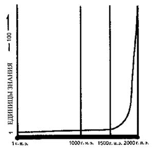 Информационный взрыв - это процесс при котором идет постоянное увеличение скорости и объёмов информации в мировом масштабе. Так же стоит рассказать о информационных барьерах[15]. Эта концепция была разработана академиком В. М. Глушковым. Представляет она расхождение между информационными запросами общества и техническими возможностями их осуществления. По Глушкову существует три информационных барьера: 1) Связан с открытием письменности, дающая возможность сохранять и передавать знания. До этого момента человеческий мозг являлся единственным местом, где хранилась информация. Этот барьер был преодолен приблизительно в 5 тысячелетии до н. э. 2) Связан с появление книгопечатания, это событие резко увеличило число информационных носителей. Преодолен этот барьер приблизительно в 15 веке. Позднее возникли новые методы распространения и хранения информации, такие как: телеграф, телефон, фотография, телевидение, кино, магнитные записи. Но пропускал информацию человек по прежнему через свой мозг, человеческий мозг обрабатывал эту информацию. 3) Связан с появлением Электронно-Вычислительными Машинами (ЭВМ), позволившие на порядок увеличить скорость обработки информации. Этот барьер был пройден в середине 20 в., вместе с появлением первого компьютера. В тот момент объёмы информации оказались настолько большими, что мозга человека и его способностей для этой обработки стало просто не хватать. И соответственно видно, что рост информации стал особо значителен после НТР. Если сейчас проанализировать прирост информации, то можно увидеть простую экспоненциальную зависимость роста количества информации от времени, которая показана на рисунке ниже.