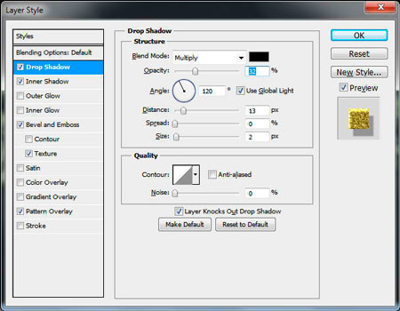 Затем нажмем Ctrl + I, чтобы инвертировать выделение, и добавим Маску слоя (Layer mask) для текстового слоя. Также, добавим Cтиль слоя (layer style) - Тень (Drop Shadow): (для этого сделаем двойной щелчок по слою). Ваш результат должен выглядеть так.