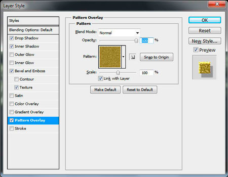 Добавим простой узор для Наложения узора (Pattern Overlay), используя картинку с блеском. Автор, например, выбрал золотой узор из этого удивительного набора блестящих Бесшовных узоров. Большой выбор узоров есть здесь.