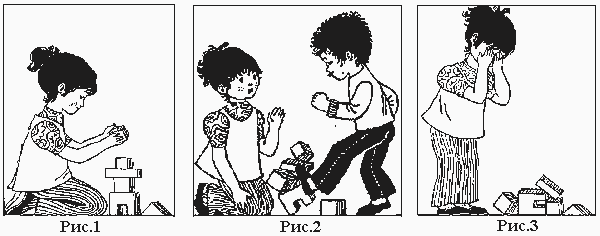 Тест «Способность к обучению в школе» для детей 5 - 7 лет Цель: Диагностика психологической готовности детей 5 - 7 лет к школьному обучению, уровня умственного развития ребенка. Тест состоит из 15 заданий. Для каждого из них предусмотрена своя система оценок, которая оговаривается в руководстве к тесту. Все результаты заносятся в бланк регистрации. Применяется исключительно индивидуально, требует хорошей предварительной подготовки исследователя. Руководство к тесту Вводное задание. (Не оценивается, так как применяется в целях установления контакта с ребенком, а также для облегчения понимания им сути первого задания). Задание состоит из серии трех последовательных картинок по сюжету «История о постройке башни» (рис. 1 - 3). Картинки нужно разложить в правильной последовательности перед ребенком. Взрослый сам рассказывает историю, указывая каждый раз на соответствующую той или иной фразе картинку. Затем картинки убираются, а ребенка просят повторить услышанный рассказ, но уже не глядя на картинки. Исследователь независимо от качества рассказа еще раз кратко формулирует суть сюжета: «Очень хорошо. Мальчик разрушил у девочки башню, и поэтому она заплакала». Первое задание: «История в картинках» (рис.4 - 6)