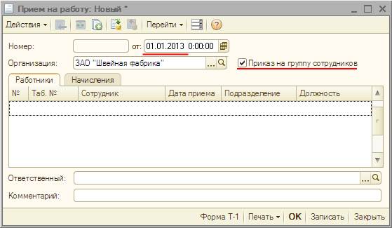 Рис. 1 Заполнение шапки документа "Прием на работу" (рис. 2): Для того, чтобы отразить прием сотрудников, работающих в организации до момента начала ведения учета в программе, необходимо оформить приказ на прием сотрудника или групповой приказ на прием сотрудников первым числом года: 1. В поле от укажите дату начала ведения учета в программе. Как правило, такой датой является первое января. 2. Установите флажок Приказ на группу сотрудников, если приказ вводится сразу на группу сотрудников.