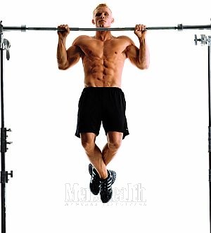 Повисни на перекладине, взявшись за нее хватом несколько шире плеч (А). Подай грудь вперед, скрести лодыжки и направь взгляд на перекладину. Сводя лопатки, подтянись вверх и постарайся коснуться турника верхней частью груди (Б). Без паузы, плавно вернись в исходное положение и повтори.
