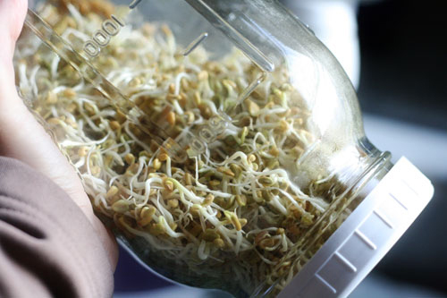 Использовать можно только не жареные и не шлифованные зерна. То есть в оболочке, если таковая предусмотрена им природой, например, не подойдет обычный белый шлифованный рис. Различные злаки (пшеница, рожь, овес, ячмень, бурый рис, кукуруза, просо) и бобовые (горох, бобы, маш, нут, чечевица, соя) употребляются в пророщенном виде или в виде отделенных от них ростков. Дело в том, что сухое семя злаковых и бобовых и они же в пророщенном виде – это несколько разные продукты. При проращивании в семени происходят значительные изменения, а именно образуются ферменты, расщепляющие сложные белки в аминокислоты, жиры в жирные кислоты, а углеводы типа крахмала на более простые сахара. За счет действия ферментов также возрастает содержание витаминов группы А, В, Е и РР, их количество увеличивается в 5-8 раз, кроме того в зелёных ростках синтезируется витамин С и хлорофилл, отсутствующие в сухих зёрнах, многократно увеличивается содержание клетчатки. Проращивать злаки и бобовые очень просто, потому что они довольно крупные и дают крупные проростки, в отличие, например, от микрозелени, о чем будет написано ниже. Существуют различные хитроумные и простые приспособления, представляющие собой ванночки, баночки, контейнеры и прочее, которые продаются как в интернет-магазинах, так и в магазинах товаров для здорового образа жизни. Описывать все разнообразие технических решений смысла не имеет, важно понять, что они есть и в огромном количестве, я же остановлюсь на самом элементарном и простом, что проще не может быть – обычная стеклянная банка 700-1500 мл с завинчивающейся крышкой. Промытые семена поместите в банку и обильно залейте прохладной или теплой, но не горячей, водой, чтобы они все были погружены в воду. Некоторым семенам для разбухания необходимо провести в воде от 10 до 24 часов, некоторым достаточно 15 минут, например, гречихе, со временем приноровитесь. При длительном замачивании меняйте воду и промывайте семена 2-3 раза в день для предотвращения их закисания, сбраживания, развития плесени и болезнетворных бактерий. Разбухание семян – знак окончания замачивания, если же семена у вас не разбухли в положенное время, то попробуйте сначала сделать для них более теплую, но опять же не горячую, воду, если и это не помогло, то вам не повезло, семена придется выбросить в компост. После разбухания слейте воду, закройте крышку, немного встряхните семена, пусть они распределяться по стенкам банки. Затем приоткройте крышку, чтобы она свободно болталась на горлышке, и чтобы под нее поступал воздух к семенам. Поставьте банку, оперев ее на что-либо, под углом примерно 45-60 градусов крышкой вниз на блюдце или тряпочку в тёплое светлое место. Продолжайте промывать проростки 2-4 раза в день, так как во влажной тёплой среде может развиться плесень, возвращая банку в исходное положение. Не допускайте высыхания проростков, иначе они погибнут. Через некоторое время вы увидите, как семена пускают корни, а позже – зелёные ростки. Пришло время воспользоваться дарами природы и плодами вашего труда. В зависимости от вида семян и своих вкусовых пристрастий подбирайте степень прорастании, после которой вы уже будете их употреблять. Какие-то злаковые хороши с проростком 5-10 мм, какие семена более вкусные и сочные с 10-50 мм ростками, а кому-то по вкусу проростки по 10 см. Если вы не испол