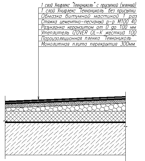 В помещениях санитарных узлов устраивается уклон полов. Уклон принимается равным i=1%. Для создания уклона на перекрытии используют цементно-песчаный раствор различной толщины. В месте трапа толщина слоя должна быть не менее 20 мм. Для обеспечения изоляции между стенами и полом устраивается зазор, который заполняется упругими прокладками. В санитарных узлах, мойке, устраивается гидроизоляция из 2 слоёв рубероида на основе битума, по поверхности оклеечной гидроизоляции перед укладкой по ней стяжки из цементного раствора предусмотрено нанесение битумной мастики с посыпкой песком крупностью 1,5–5,0 мм. Гидроизоляция устраивается непрерывной в конструкции пола. В местах примыкания пола к стенам гидроизоляцию непрерывно продолжают на высоту 300 мм от уровня покрытия пола. Кровля Современные крыши – это, прежде всего, новые материалы и технические решения, улучшающие такие показатели, как надежность, долговечность и эстетический вид. Выбор материалов кровельной системы должен быть основан на принципе согласования сроков службы всех составляющих Надежность и долговечность крыши обеспечивается также правильным выполнением работ по монтажу (обустройству) всей кровельной системы. Кровля - это верхний элемент крыши (покрытие), предохраняющий здания от всех видов атмосферных воздействий. Основные элементы крыши выполняют одновременно несущие, гидроизолирующие и теплоизолирующие функции. Конструкция кровли принята по [8]. Плита покрытия толщиной 300 мм из тяжелого монолитного бетона класса В25 утепляется в построечных условиях слоем эффективной теплоизоляции IZOVER OL-K жесткий толщиной 100 мм, производится засыпка керамзитовым гравием плотностью 500 кг/куб.м толщиной от 50 до 200 мм в целях создания необходимого уклона для стока воды к водосточным воронкам. По керамзитовому гравию устраивается цементная армированная стяжка толщиной 40 мм, по которой наклеивается двухслойный изоляционный ковер из унифлекса (см. рис. 7). С учетом этажности и объемно-планировочного решения здания принят тип внутренней организации отвода атмосферных осадков (через расположенные внутри здания стояки – водоотводы). Предусмотрены шесть внутренних воронок диаметром 150 мм, исходя из площади кровли [9]. Уклонообразующий слой лёгкого бетона создаёт уклон 3%. Водосток с машинного отделения – наружный организованный. Выполнен аналогично основной кровле здания.