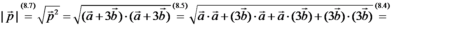 ◄ Используя выражение (8.7) длины вектора и (8.8) угла между векторами через скалярное произведение и свойства скалярного произведения, имеем 1)