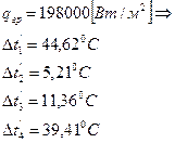 Складываем ординаты четырех зависимостей, строим кривую температурных перепадов. На оси ординат из точки, соответствующей Dt2, проводим прямую, параллельную оси абсцисс, до пересечения с кривой Dtå = åf(qi). Из точки пересечения опускаем перпендикуляр на ось абсцисс и находим значение удельного теплового потока qгр, кВт/м2. Пусть: