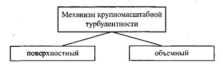Рис. 1.2. Классификация турбулентного горения При горении однородной смеси в режиме турбулентного горения возможны два случая: возникновение мелкомасштабной и крупномас- Глава 1. Основные понятия теории горения штабной турбулентности. Такое разделение производится в зависимости от соотношения масштаба турбулентности и толщины фронта пламени. При масштабе турбулентности меньшем толщины фронта пламени ее относят к мелкомасштабной, при большем - к крупномасштабной. Механизм действия мелкомасштабной турбулентности обусловлен интенсификацией процессов горения за счет ускорения процессов тепломассопере-носа в зоне пламени. При описании мелкомасштабной турбулентности в формулах для скорости распространения пламени коэффициенты диффузии и температуропроводности заменяются на коэффициент турбулентного обмена. Наибольшие скорости горения наблюдаются при крупномасштабной турбулентности. В этом случае возможны два механизма ускорения горения: поверхностный и объемный.