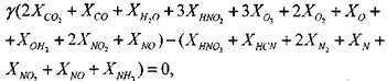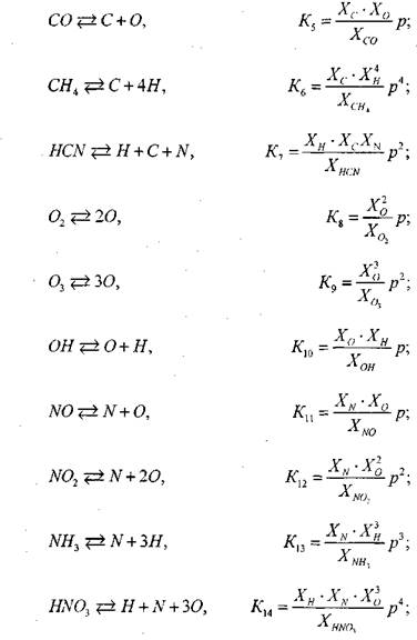 Число независимых уравнений химического равновесия равно разности числа компонентов продуктов сгорания и числа химических элементов в системе. В качестве независимых выбраны следующие четырнадцать реакций: (1.30) (1.31) (1.32) (1.33)