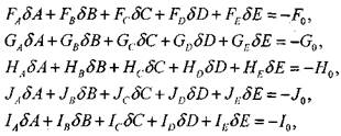 После умножения обеих частей уравнения (1.28) на можно вычислить сумму Опишем метод решения системы уравнений (1.15), (1.23)-(1.43), содержащей 21 неизвестную величину: 19 мольных долей продуктов сгорания доли остальных 14 продуктов сгорания выражаются через константы равновесия и выбранные независимые переменные из уравнений (1.29)-(1.43). Далее перепишем уравнения (1.23)-(1.26) и (1.28) соответственно в виде F(A,B, C,D,E) = 0, G (А, В, С, D, Е) = 0, H(A,B,C,D,.E) = 0, (1.49) J (А, В, С, D, Е) = 0, I (А, В, С, D, Е) = 0. Линеаризовав систему уравнений (1.49) разложением в ряд Тейлора с точностью до членов, содержащих первые производные, получаем
