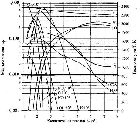 Рис. 1.3. Зависимость состава и температуры продуктов сгорания гексано-воздушной смеси при давлении 0,101 МПа и начальной температуре 298,15 К от концентрации гексана Date: 2015-09-18; view: 712; Нарушение авторских прав |