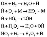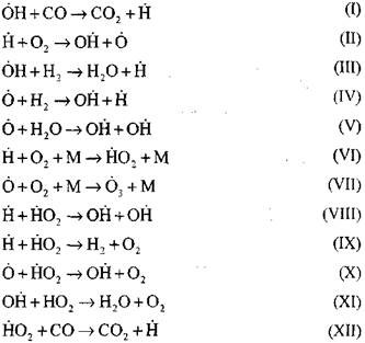 Суммарная скорость реакции СО определяется скоростью процесса разветвления. Конечные продукты образуются только при этой реакции. На каждый элементарный акт разветвления цепи образуются