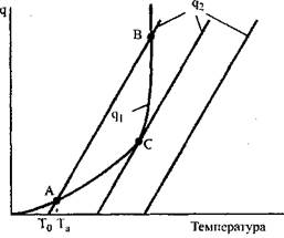 Рис. 3.1. Тепловыделение qi и теплоотвод q 2 при химической реакции смеси в сосуде объемом V При установившемся состоянии реагирующей смеси тепловыделе-ние от реакции q1 будет равно теплоотводу q2. Соответствующая этому встоянию температура будет равна абсциссе точек пересечения кривых q1(T) и q2(T). Из рис. 3.1 видно, что кривые тепловыделения и теплоотвода иногда пересекаются в двух точках, а иногда - в одной. Рассмотрим первый случай - пересечение в двух точках. Смесь с начальной температурой Т0 за счет теплоты реакции будет нагреваться до Корольченко А.Я. Процессы горения и взрыва равновесного состояния, отображаемого точкой С (при этом температура реагирующей смеси равна Та). Это состояние системы будет устойчивым, поскольку дальнейшее повышение температуры сопровождается превышением теплоотвода над тепловыделением. Вторая точка пересечения кривых В лежит в области более высоких температур и тепловой режим системы в этом случае будет неустойчивым. При отклонении от состояния, отвечающего точке В, система в прежнее состояние уже не возвратится, а будет все более отклоняться от него. При увеличении начальной температуры стенок сосуда Т0 прямая, характеризующая теплоотвод, будет смещаться вправо, а температура реагирующей смеси Та будет непрерывно и плавно возрастать. При некоторой температуре Тсв кривые qi(T) и q2(T) соприкасаются (точка С), что физически означает равенство при этой температуре величин тепловыделения и теплоотвода. Точка С характеризует граничные условия существования стационарного режима. При незначительном повышении температуры стенки сосуда по сравнению с Тсв тепловыделение будет превышать теплоотвод и произойдет резкое увеличение температуры реагирующей смеси. Явление, заключающееся в переходе от медленно протекающей реакции, сопровождающейся незначительным разогревом, к бурному прогрессивно ускоряющемуся выгоранию смеси, называется самовоспламенением. В научной литературе его часто называют явлением «теплового взрыва». Рассмотрим количественные соотношения, характеризующие про В точке касания кривых тепловыделения и теплоотвода величины q