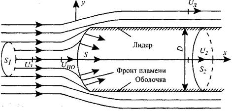 Рис. 4.25. Схема течения газовой фазы вблизи головной части лидера В соответствии с выражением (4.58)