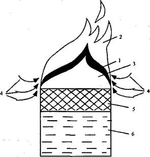 Рис. 4.26. Схема диффузионного горения жидкости 1 - зона горения; 2 - зона догорания; 3 - пары жидкости; 4 - конвективные токи воздуха; 5 - зона подогрева жидкости; 6 — жидкость в резервуаре Подвод тепла к жидкости в процессе диффузионного горения осуществляется главным образом теплопередачей излучением от факела пламени. Скорость выгорания определяется величиной теплоты испарения жидкости и количеством тепла, подведенного к поверхности жидкости от факела пламени. Значения скоростей выгорания некоторых жидкостей приведены в табл. 4.4 Таблица 4.4 Скорость выгорания жидкостей