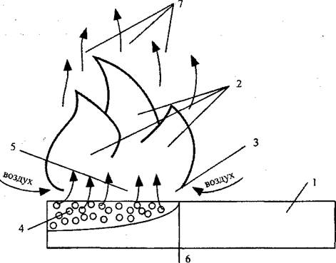 Рис. 4.31. Модель горения твердых материалов • Зона без реакции - зона прогрева конденсированной фазы. У термопластичных материалов эта зона ограничивается слоем расплава. Толщина зоны прогрева зависит от соотношения коэффициента температуропроводности и скорости горения. Для многих материалов толщина этой зоны составляет около 3 мм. • Зона пиролиза - реакционная зона в конденсированной фазе, в которой происходит разложение твердого материала на газообразные продукты. • Предпламенная зона в газовой фазе, в которой низкомолекулярные продукты пиролиза дополнительно разлагаются. Здесь же начинается процесс воспламенения, который инициируется атомами водорода, диффундирующими в предпламенную зону из зоны пламени. • Зона пламени или реакционная зона в газовой фазе. В этой зоне протекают основные реакции окисления, выделяется основная часть тепла и наблюдается максимальная температура. • Зона продуктов сгорания. Истинно гетерогенным является горение нелетучих металлов. ns Корольченко А.Я. Процессы горения и взрыва _________________________ Таким образом, характерной особенностью горения твердых материалов является многостадийный процесс их превращения в конечные продукты сгорания. Этот процесс включает в себя следующие стадии: • поглощение твердым материалом тепловой энергии от источника зажигания; • разложение конденсированной фазы с образованием летучих продуктов и карбонизированного остатка; • воспламенение газообразных продуктов пиролиза; • горение газообразных продуктов пиролиза. термическое разложение твердого материала. Первичное возникновение пламени рассматривается как процесс зажигания. Зажигание является сложным нестационарным процессом, который заключается в быстром разогреве локального участка твердого материала до высокой температуры открытым пламенем, электрической искрой, накаленным телом. В результате такого воздействия над поверхностью твердого материала возникает пламя. Для устойчивого зажигания температура поверхности должна быть доведена до температуры близкой к температуре поверхности при горении в условиях стационарного процесса. Переход от зажигания к стационарному режиму горения твердого материала возможен с момента появления пламени. Воспламенение твердых материалов в воздухе рассматривается с позиций теории воспламенения газов. Однако, возможны условия, когда процесс горения начинается вследствие гетерогенной реакции взаимодействия кислорода с поверхностным слоем. Характер переноса тепла к твердому материалу для его нагрева и воспламенения зависит от вида источника зажигания и условий воздействия теплового потока на поверхность. В условиях пожара твердые материалы разогреваются в основном за счет конвективного и радиационного переноса тепла от пламени. Поглощение тепла твердым материалом при излучении зависит от спектральных характеристик материала и источника теплового потока. В нагретом под действием потока тепла поверхностном слое происходит пиролиз твердых материалов. При этом основную роль играет термоокислительная деструкция. Однако, преобладание термической или термоокислительной деструкции в процессе газификации твердых материалов при Глава 4. Развитие горения горении зависит от природы материала, механизма его разложения, температуры пиролиза, з