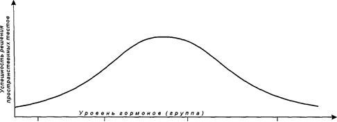 Интеллект в структуре психики 127 Особого внимания заслуживают результаты исследований влияния гормонального фона на успешность решения задач [9]. Высокий уровень тестостерона в крови положительно коррелирует с успешностью выполнения женщинами задач на пространственное мышление, у мужчин зависимость обратная. Мужчины с низким уровнем тестостерона лучше справляются с математическими тестами, чем мужчины с высоким уровнем этого гормона. Между тем у женщин подобной зависимости не выявлено. Кроме того, выявлено, что девочки с высоким уровнем андрогенов лучше выполняют тесты на пространственное мышление, чем их «нормальные» сверстницы. Оригинальные исследования провел Р. Л. Вудфорд. Он давал задания на пространственное мышление женщинам до родов и после них, поскольку именно в эти периоды наблюдается максимальное колебание уровня гормонов. Когда у женщин снижался уровень эстрогенов в крови, выполнение пространственных тестов резко улучшалось. В исследованиях других авторов обнаружено снижение умственной активности в предменструальную и менструальную фазы цикла [9]. Что касается математических способностей, то у мужчин связь между уровнем гормонов и успешностью обратная (по аналогии с пространственными способностями), а у женщин корреляция отсутствует. Попытки «преодолеть разницу полов», как правило, предпринимают исследователи-женщины. В частности, Д. П. Уабер [10] предположила, что различия в успешности выполнения тестов определяются не полом, а индивидуальной скоростью созревания (которая находится под контролем гормонов), следовательно, все индивиды, опережающие в своем развитии сверстников, должны лучше выполнять вербальные тесты, чем пространственные. Поскольку девочки опережают мальчиков в развитии, их речевые навыки доминируют над пространственными. Тем самым взаимодействуют два фактора: пол и индивидуальность темпа общего развития. Д. П. Уабер успешно проверила свою гипотезу, но больше никто ее данные не подтвердил [9]. В 1983 году Валерия Шут (Калифорнийский институт) провела «критическое исследование», ей удалось показать, что женщины с высоким уровнем андрогенов действительно лучше справляются с пространственными тестами, но у мужчин зависимость обратная, а именно: чем ниже содержание андрогенов, тем успешнее мужчина справляется с тестом на пространственное мышление! Ряд авторов выдвигает концепцию «оптимума» гормонального фона. Схематически она выглядит так (рис. 28). Камилла Бенбоу (Университет штата Айова, США) обнаружила, что половые различия в частоте встречаемости высокого уровня математических способностей (верхняя часть тестовой шкалы) очень велики: на 13 мужчин приходится 1 женщина [9]. Что касается пространственных способностей, то здесь проблема более запутана. Предоставим слово Т. В. Виноградовой и В. В. Семенову: «В 1961 году Р. Е. Стэнфорд получил данные, свидетельствующие о том, что способности к пространственному воображению передаются от матери к сыну и от отца к дочери, но