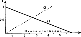 Крайним вариантом — полной свободы — является творческая деятельность в свободной ситуации. По определению Пиаже, интеллект есть способность адап-тирования к трудным условиям (в том числе — новым). Следовательно, интеллект максимально активизируется в условиях тестирования, предъявляющих жеские требования к адаптационным возможностям индивида. Креативность проявляется в ситуациях, когда поведение испытуемых не регламентируется. Следовательно, и корреляции тестов скоростного интеллекта с тестами креативности будут определяться сходством или различием ситуаций тестирования. Чем более свободна тестовая деятельность испытуемого, тем выше будет корреляция теста с «идеальным» тестом креативности; чем более регламентирована деятельность испытуемого, тем выше будут корреляции данного теста с «идеальным» тестом интеллекта. Под «идеальным» подразумевается тест, максимально валидный по отношению к измеряемому свойству. Представим эти теоретические зависимости на графике (рис. 48).