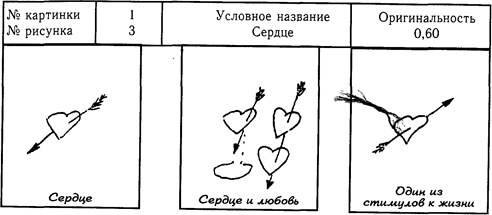 тингента. Если выборка сильно отличается от предлагаемой, то необходимо анализировать результаты по всей новой выборке и только тогда давать заключения об отдельных людях. В лаборатории диагностики способностей и ПВК имеется компьютерная программа ввода данных и обработки результатов для IBM PC. Для оценки результатов тестирования людей, относящихся к контингенту менеджеров или схожему с ним, предлагается следующий алгоритм действий. Необходимо сопоставить дорисованные с имеющимися в атласе и при нахождении схожего типа присвоить данному рисунку оригинальность, указанную в атласе. Если в атласе нет такого типа рисунков, то оригинальность данной дорисованной картинки считается 1,00. Индекс оригинальности подсчитывается как среднее оригинальностей всех картинок. Пусть первый рисунок схож с картинкой 1.5 атласа. Ее оригинальность — 0,74. Второй рисунок схож с картинкой 2.1. Ее оригинальность — 0,00. Третий рисунок ни на что не похож, но первоначально предлагаемые к дорисовке элементы в рисунок не включены. Такая ситуация интерпретируется как уход от задания и оригинальность данного рисунка оценивается 0,00. Четвертый рисунок отсутствует. Пятый рисунок признан уникальным (ни на что в атласе не похожим). Его оригинальность — 1,00. Щестой рисунок оказался схожим с картинкой 6,3 и его оригинальность 0,67. Такр^м образом, суммарной балл для данного протокола — 2,41 / 5 = 0,48.»^^^ При оценке оригинальности данного рисунка следу^рлринимать во внимание, что иногда «типичные» рисунки появляются в ответ накетипичные для них стимулы. Так, для картинки 1 наиболее типичен рисунок, названный нами условно «облако». Такого же типа рисунок может появиться в ответ на стимульный материал картинки 2 или 3. В атласе такие случаи дублирования не приводятся и оригинальность таких рисунков следует оценивать по имеющимся для других картинок изображениям. В нашем случае оригинальность рисунка «облако», появившегося на второй картинке, оценивается 0,00 баллами. Индекс уникальности (количество уникальных картинок) данного протокола — 1. Используя процентильную шкалу, построенную для этих двух индексов, можно определить место данного человека относительно предлагаемой выборки и соответственно сделать выводы о степени развития у него невербальной креативности. Результаты рассмотренного выше протокола показывают, что данный человек находится на границе 80 %. Это означает, что примерно у 80 % людей в данной выборке невербальная креативность (по индексу оригинальности) оказалась выше, чем у него. Однако индекс уникальности у него выше и только 20 % имеют индекс более высокий. Для оценки креативности как таковой большее значение имеет индекс уникальности, показывающий, насколько действительно новое может создать человек, но дифференцирующая сила предлагаемого индекса мала и поэтому как вспомогательный используется индекс оригинальности.