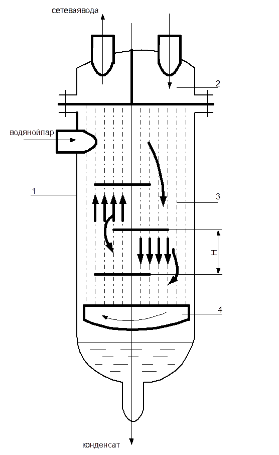 Пароводяной сетевой подогреватель представляет собой теплообменник, в котором греющей средой является водяной пар, а нагреваемой – сетевая вода, направляемая на нужды теплоснабжения. Отечественной промышленностью изготавливается значительное количество теплообменников как горизонтального, так и вертикального типов. В нашей задаче используется вертикальный тип. Пароводяной сетевой подогреватель, представленный на рисунке 1, состоит из цилиндрического корпуса с овальным днищем и крышкой. Внутри установлен трубный пучок, состоящий из латунных труб, вставленных концами в отверстия верхней и нижней трубных досок и закреплённых развальцовкой концов. По высоте трубного пучка установлено ряд промежуточных перегородок, ужесточающих трубки. К нижней доске крепится поворотная камера. В крышке предусмотрены два штуцера для подвода и отвода водяного пара, в днище – для удаления конденсата. Водяной пар, делая ряд поворотов, омывает латунные трубки, снаружи конденсируется. Конденсат стекает вниз по поверхности трубок, снимается перегородками и стекает вниз. Чем меньше среднее расстояние между перегородками Н, тем тоньше конденсатная пленка на трубках, тем эффективней теплообмен межу паром и стенкой трубок. Сетевая вода движется внутри трубок по двухходовой или чётырех ходовой схемам установкой перегородок в крышке и поворотной камере, воспринимает теплоту от пара и нагревается. Таким обзором, цилиндрическая часть всех трубок и составляет поверхность теплообмена Fт теплообменника. Основными расчетными параметрами типового теплообменника, изготовляемого отечественной промышленностью являются: поверхность теплообмена Fт [м2], сечение для прохода сетевой воды S [м2] и среднее расстояние между трубными перегородками Н [м] (таблица1).
