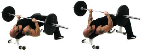 Частичный жим лежа на скамье с обратным наклоном с изометрическим удержанием в нижней части амплитуды (Полужим с паузой) (BB partial decline bench press w/isometric hold (bottom)) Как и прежде, удерживайте по 3 секунды гриф у груди, кроме того, отрегулируйте скамью, придав ей небольшой обратный наклон.