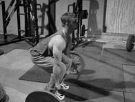 9. Прогулка Уотербери (Waterbury walk) – выполняется так. Стоя в двух полных шагах от стоек (плинтов), расположенных ниже колен, взять прямым хватом штангу, сделать два шага, положить штангу на стойки, перевести дух, взять штангу, пройти от стоек два шага в обратную сторону (задом), положить штангу на пол. Это будет одно повторение.