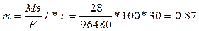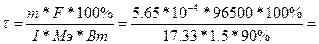 748. Приведенные формулы идентичны, поскольку 749. Постоянная Фарадея F = 96487 Кл – количество электричества, выделяющее при электролизе один грамм-эквивалент любого вещества. Электрохимический эквивалент Кэ численно равен массе вещества, выделившейся при действии одного кулона электричества. Кэ = Э/F. Для меди Кэ = 32/96487 = 3.32*10-4 г., для серебра Кэ = 108/96487 = 1.12*10-3 г., для NaOH Кэ = 40/96487 = 4.14*10-4 г. 750. Затраченное на электролиз электричество расходуется не только на целевую реакцию, но и на побочные процессы – окисление примесей и др. Поэтому масса вещества оказывается меньше теоретически рассчитанной. Отношение масс называется выходом по току. 751. Электролиз CuSO4 + H2O = Cu + H2SO4 + 1/2O2