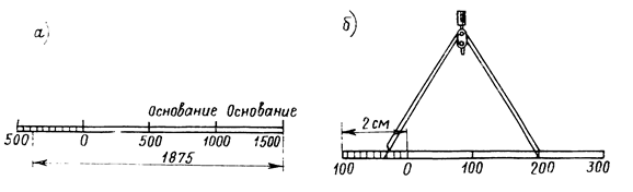 Масштабы бывают численные и графические. Численный масштаб фиксируют двумя способами. 1. В виде простой дроби 2. В виде именованного соотношения, например в 1 см 20 м. Целесообразность такого соотношения определяется тем, что при изучении местности по карте удобно и привычно оценивать длину отрезков на карте в сантиметрах, а длину горизонтальных проложений на местности представлять в метрах или километрах. Для этого численный масштаб преобразовывают в разнотипные единицы измерения: 1 см карты соответствует такому-то количеству метров (километров) местности. Пример 1. На плане Решение: 1,5 ´ 5000 = 7500 см = 75 м (или 1,5 ´ 50 = 75 м). Пример 2. Горизонтальное проложение между двумя точками на местности равно 40 м. Чему будет равно расстояние между этими же точками на плане М = 1:2000 (в 1 см 20 м)? Решение: Чтобы избежать вычислений и ускорить работу, пользуются графическими масштабами. Таких масштабов два: линейный и поперечный. Для построения линейного масштаба выбирают исходный отрезок, удобный для данного масштаба (чаще длиной 2 см). Этот исходный отрезок называется основанием масштаба (рис. 5). Основание откладывают на прямой линии необходимое число раз, крайнее левое основание делят на части (обычно на 10 частей). Затем линейный масштаб подписывают, исходя из того численного масштаба, для которого он строится (на рис. 5, а для М = 1:25 000). Такой линейный масштаб позволяет определенным образом оценить отрезок с точностью в 0,1 доли основания, дополнительную часть этой доли приходится оценивать на глаз. Для обеспечения необходимой точности измерений угол между плоскостью карты и каждой ножкой циркуля-измерителя (рис. 5, б)не должен быть менее 60°, и измерение длины отрезка следует произвести не менее двух раз. Расхождение D S (в метрах) между результатами измерений должно быть