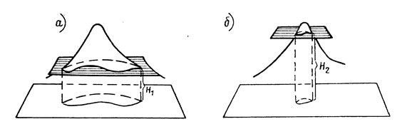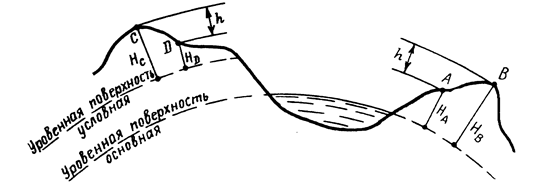 При проведении практических съемок часто оказывается целесообразным определять отметки не относительно основной, а относительно условно принятой уровенной поверхности. Тогда отметки в первом случае называются абсолютными, во втором – условными (HA, НВ – абсолютные отметки; HD, НC – условные). В Российской Федерации основная (исходная) уровенная поверхность зафиксирована кронштадтским футштоком. По многолетним наблюдениям за уровнем моря в Кронштадте был установлен средний уровень. В гранитном устое моста через канал закреплена медная пластина, на ней чертой зафиксирован средний уровень. Эту черту именуют нулем кронштадтского футштока. Относительно уровенной поверхности, проходящей через нуль кронштадтского футштока, и определяются абсолютные отметки на всей территории страны. Условные поверхности (и соответственно условные отметки) применяются для различных участков местности независимо. Точки физической поверхности Земли характеризуются различными отметками. Но если известны отметки двух точек, то можно вычислить превышение одной точки над другой (относительную высоту). Так, превышение точки В над точкой А (рис. 1.19) составит: h = НВ – НА. Метод горизонталей позволяет определить отметки любых точек топографической карты или плана. Построение горизонталей осуществляется исходя из следующего. Пусть имеется некоторая возвышенность (рис. 1.20, а), которую пересекает поверхность, параллельная уровенной и расположенная от нее на высоте H 1. Линия пересечения физической поверхности Земли будет замкнутой кривой, и, будучи спроектированной на горизонтальную плоскость, эта линия, называемая горизонталью, характеризует данную возвышенность на отметке H 1. Если для той же возвышенности секущую поверхность примем на высоте H 2 (рис. 1.20, б), то получим другую горизонталь, характеризующую возвышенность на этой высоте.