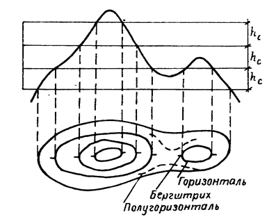 Для того чтобы получить достаточно детальную характеристику данной формы рельефа, следует задать необходимое количество секущих поверхностей через равные промежутки по высоте hc. (рис. 1.21).Каждая поверхность и соответственно каждая горизонталь характеризуется определенной отметкой. Отсюда определение: горизонтали – линии, соединяющие точки земной поверхности с одинаковыми отметками.