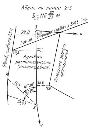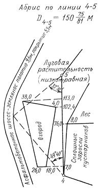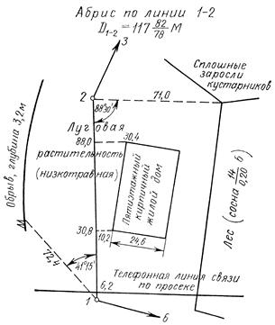 Для нанесения вершин теодолитного хода определяют квадрат сетки, в котором эта вершина находится, при помощи циркуля-измерителя и поперечного масштаба откладывают по сторонам квадрата (рис. 1.60) значения разностей координат данной вершины угла и соответствующей линии координатной сетки (точки 1 и 2, 3 и 4). Соединив точки 1 и 2, 3 и 4 получают в пересечении отрезков искомую вершину полигона (например, вершину угла 5). В этой точке иглой циркуля делают накол и вычерчивают условный знак точки плановой съемочной сети. Для каждой пары точек определяют расстояние между ними и сравнивают его с приведенным на схеме полигона (см. рис. 1.59) расхождение не должно превышать 0,3 мм (в масштабе плана). Построение контуров местности на плане производят по абрисам (см. рис. 1.53 1.58). Способ вычерчивания контуров определяется способом съемки, при этом применяют геодезический транспортир, поперечный масштаб, линейку и выверенный прямоугольный треугольник. Все построения выполняют предельно тонкими линиями, так как часть этих линий при последующей разработке плана будет заменяться на точечный пунктир, линии вспомогательных построений должны быть убраны. Значения углов и длин линий, приведенные в абрисах, на план не выписывают. После вычерчивания контуров оформление плана производится в точном соответствии с обязательными условными знаками, т.е. на план наносят в карандаше условные знаки с соблюдением их размеров и начертания согласно действующим «Условным знакам для планов масштаба 1:5000; 1:2000; 1:1000; 1:500». 1.13. Проект вертикальной планировки