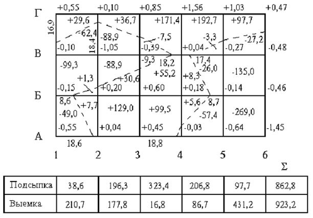 Все вычисления ведутся в ведомости (табл. 1.7), где окончательно получают объем выемки VВ и подсыпки VП.