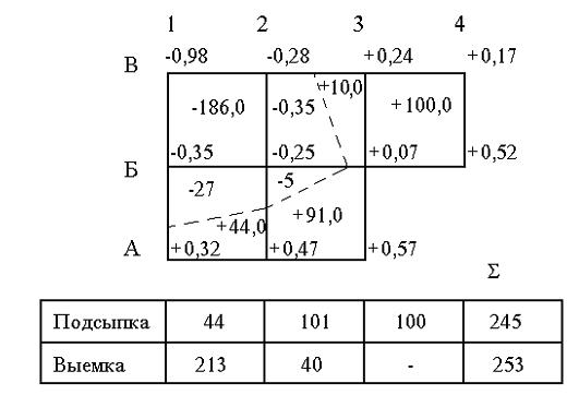Рис. 1.67. Картограмма земляных работ в случае нечетного количества квадратов